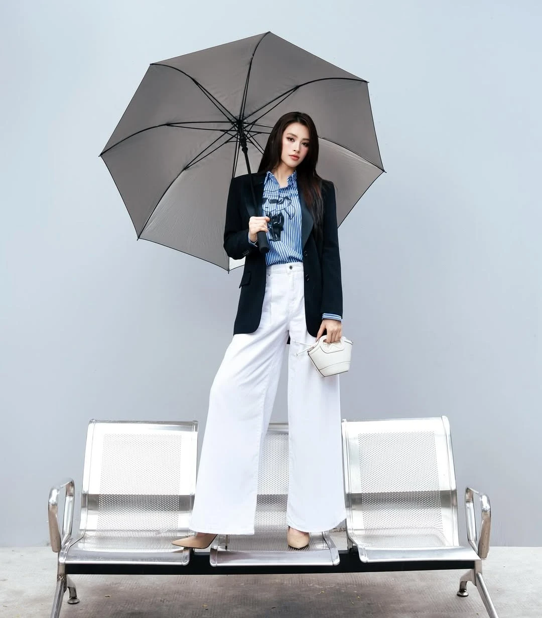 Hoa hậu Tiểu Vy đã chứng minh cách làm mới “cổ điển” bằng áo sơ mi kẻ sọc xanh‑trắng, cổ mở nhẹ và blazer đen suông. Kết hợp với quần ống rộng trắng cạp cao, toàn bộ trang phục trở nên mạch lạc, giúp vóc dáng thon gọn hơn trong mọi chuyển động. Phụ kiện tối giản – một chiếc túi cầm tay nhỏ – hoàn thiện vẻ quý cô hiện đại.